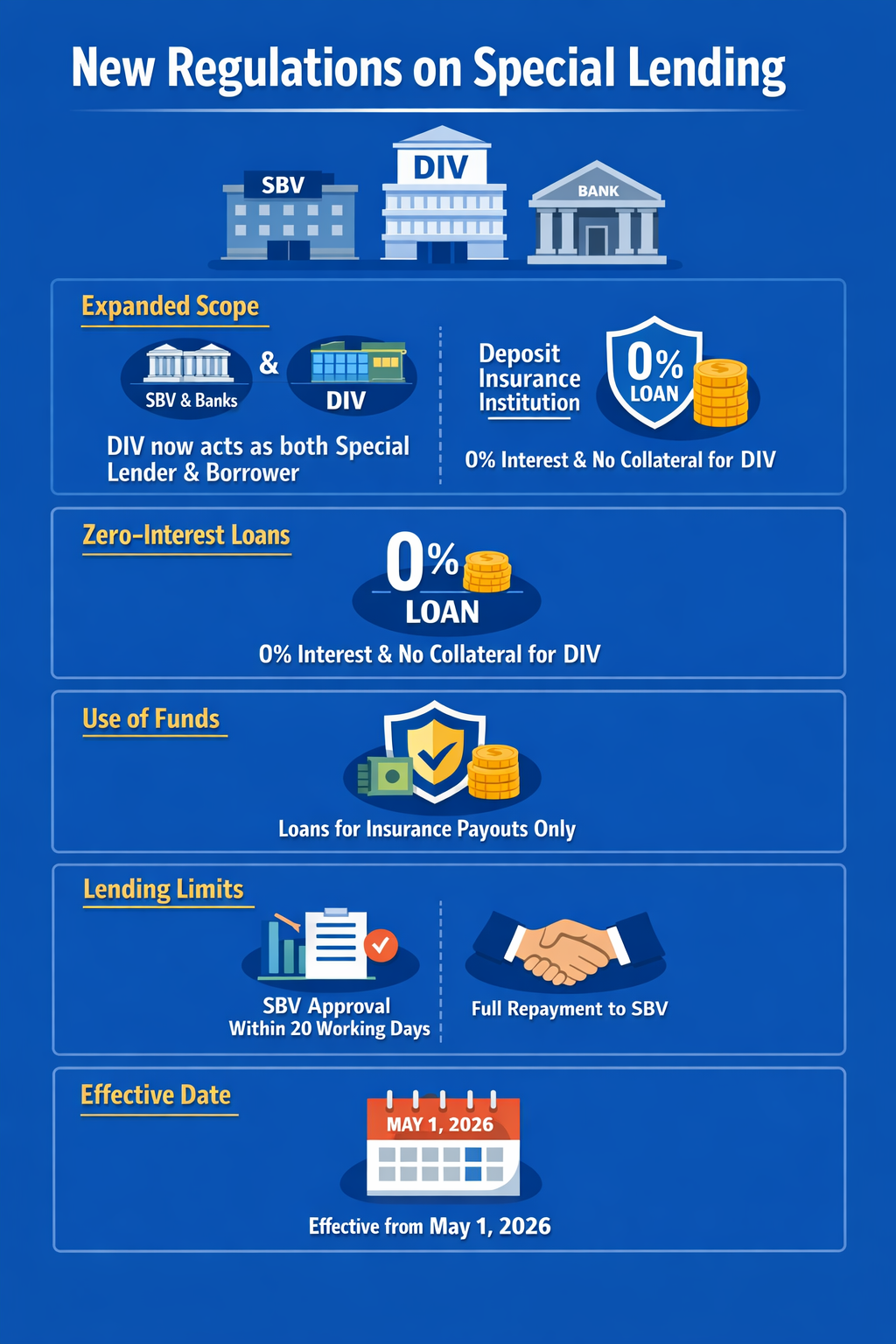 The Circular broadens the scope of applicable entities, explicitly including the Deposit Insurance of Vietnam (DIV) and other relevant organizations and individuals involved in special lending activities. This marks a notable development, positioning the deposit insurance institution as a formal participant in the special lending mechanism alongside the SBV and credit institutions.