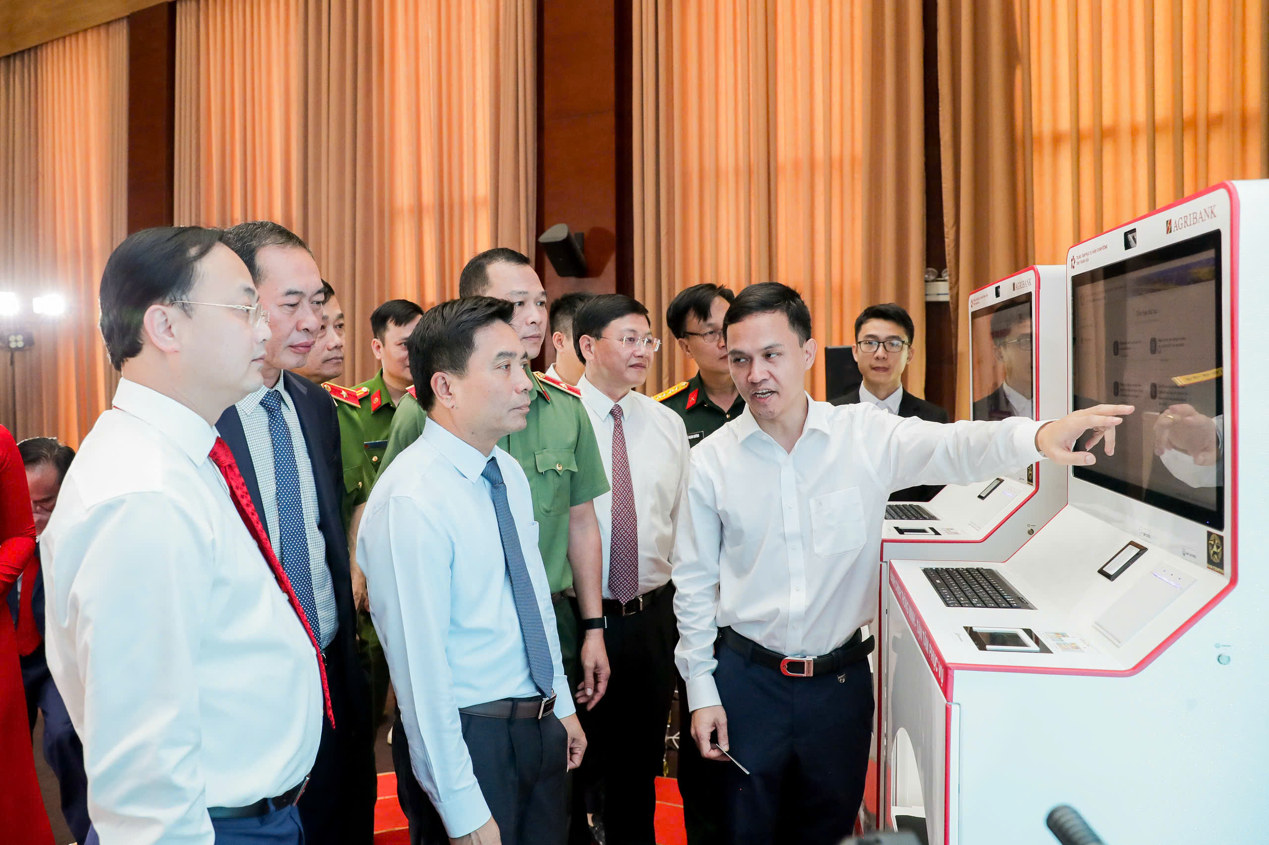 Đồng chí Tô Huy Vũ - Chủ tịch HĐTV Agribank và đồng chí Nguyễn Doãn Anh - Ủy viên Ban Chấp hành Trung ương Đảng, Bí thư Tỉnh ủy tỉnh Thanh Hoá, cùng đại biểu tham gia tra nghiệm mô hình thí điểm Kiosk thông minh và Hệ thống xác thực, cấp bản sao số tài liệu điện tử