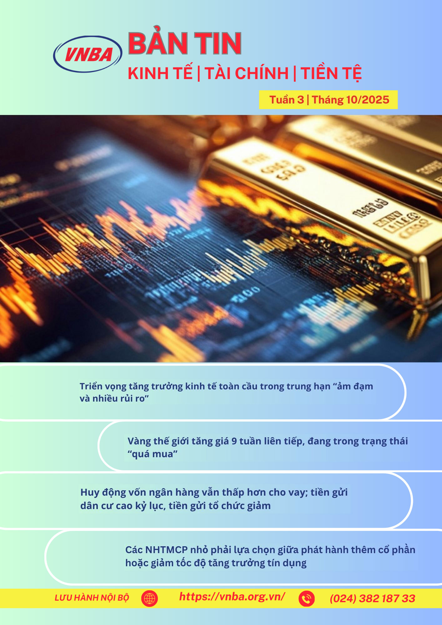 Triển vọng kinh tế toàn cầu “ảm đạm và nhiều rủi ro”; Kinh tế Mỹ: Thặng dư ngân sách, kỳ vọng lạm phát giảm nhưng rủi ro tài chính và thương mại còn dai dẳng; Vàng thế giới tăng giá 9 tuần liên tiếp, đang trong trạng thái “quá mua”. Đến nay, cả nước đã giải ngân 455 nghìn tỷ đồng, đạt 50,7% kế hoạch; Huy động vốn ngân hàng vẫn thấp hơn cho vay; tiền gửi dân cư cao kỷ lục, tiền gửi tổ chức giảm;... Đây là một số thông tin chính trong Bản tin Kinh tế - Tài chính - Tiền tệ tuần 3 tháng 10/2025.