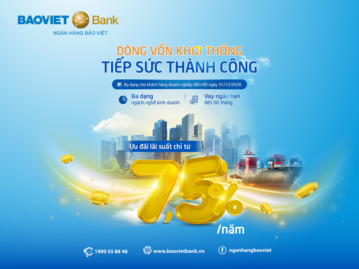 Đối với khách hàng doanh nghiệp, BAOVIET Bank đưa ra gói tín dụng ưu đãi 600 tỷ đồng với lãi suất chỉ từ 7,5%/năm, áp dụng xuyên suốt thời gian vay, giúp doanh nghiệp chủ động kế hoạch tài chính và kiểm soát chi phí vốn, đáp ứng đa dạng nhu cầu và ngành nghề kinh doanh, từ sản xuất, thương mại đến dịch vụ.