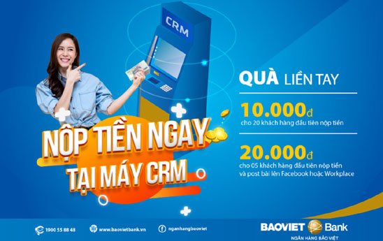 Từ ngày 19/11 đến 18/12/2021, Ngân hàng Bảo Việt (BaoVietBank) triển khai chương trình khuyến mãi “Nộp tiền ngay - Quà liền tay” dành cho khách hàng tại 08 điểm CRM mở mới trên địa bàn: Hà Nội, TP Hồ Chí Minh, Thanh Hóa, Đăklăk, Cần Thơ, Kiên Giang, Gia Lai.
