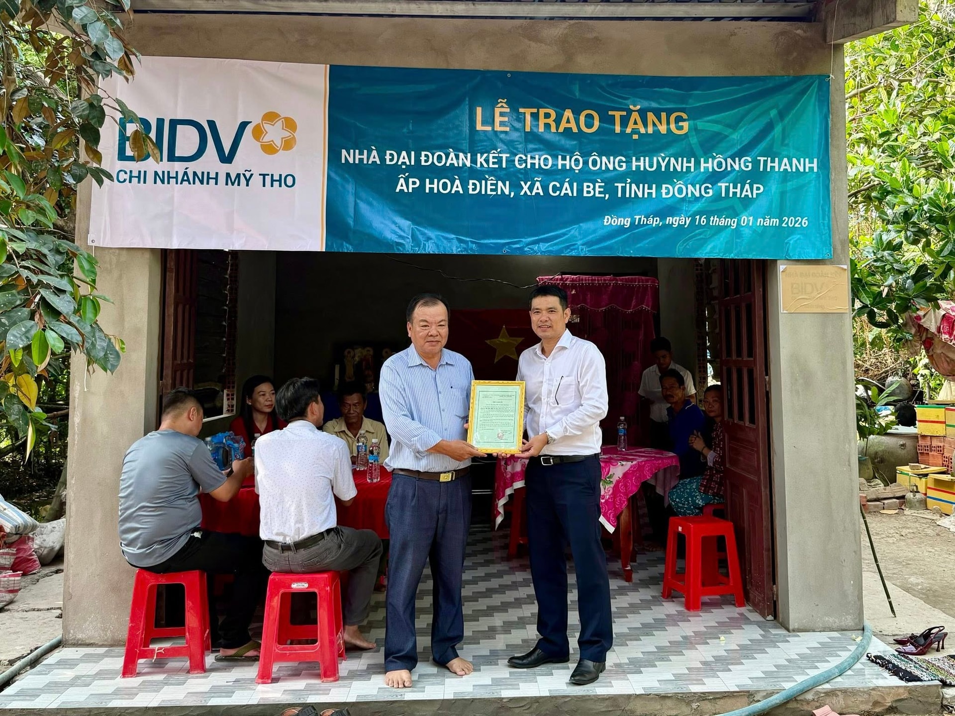 Trước đó, ngày 16/01/2026, BIDV Mỹ Tho đã phối hợp cùng chính quyền địa phương tổ chức lễ bàn giao Nhà Đại đoàn kết cho hộ gia đình có hoàn cảnh khó khăn tại ấp Hòa Điền, xã Cái Bè, tỉnh Đồng Tháp.