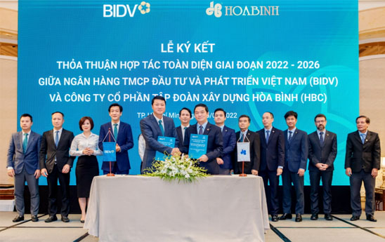 Mới đây, tại TP. Hồ Chí Minh,Ngân hàng Đầu tư và Phát triển Việt Nam (BIDV) và Công ty cổ phần Tập đoàn Xây dựng Hòa Bình (HBC) đã ký kết thỏa thuận hợp tác toàn diện giai đoạn 2022-2026.