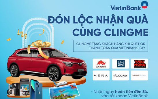 Clingme sẽ hoàn tiền trực tiếp vào tài khoản VietinBank của khách hàng khi khách hàng sử dụng VietinBank iPay quét mã QR Clingme tại gần 1.000 cửa hàng trên toàn quốc. Mức hoàn tiền đến 8% trên tổng giá trị đơn hàng, không giới hạn số tiền hoàn, không giới hạn số lần hoàn tiền và áp dụng đồng thời với các Chương trình khuyến mại khác tại địa điểm.