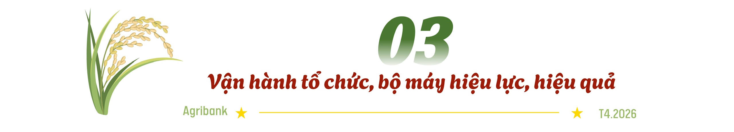 Trên nền tảng đó, Agribank quán triệt nguyên tắc vận hành thống nhất, xuyên suốt dưới sự lãnh đạo của Đảng ủy; đồng thời bảo đảm phân công rõ ràng, phối hợp chặt chẽ và kiểm soát hiệu quả giữa Hội đồng thành viên, Ban điều hành và các đơn vị trong toàn hệ thống. Chức năng, nhiệm vụ, thẩm quyền của từng cấp, từng bộ phận được xác định minh bạch, gắn với trách nhiệm cụ thể, bảo đảm vận hành đồng bộ, thông suốt, hiệu lực và hiệu quả.