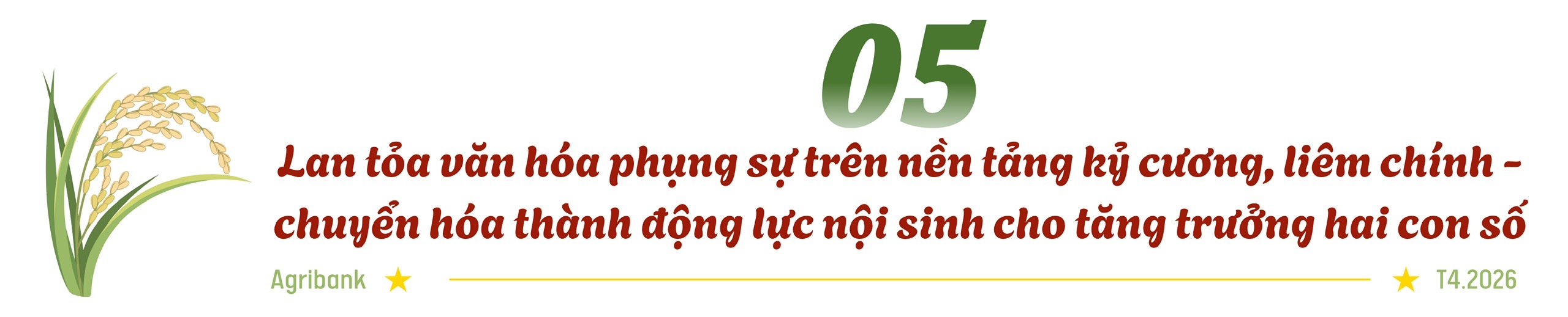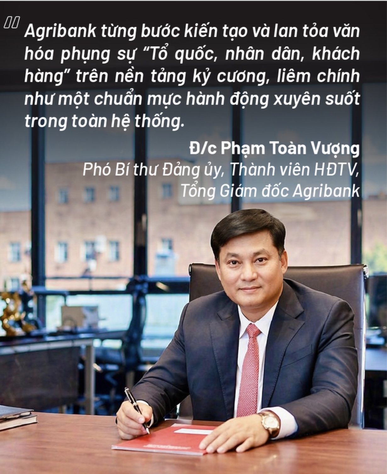 Trong tiến trình phát triển, Agribank ý thức sâu sắc rằng, niềm tin của khách hàng, xã hội là nguồn lực quan trọng nhất, là nền tảng cho sự phát triển bền vững; và niềm tin ấy không tự nhiên có, mà được tích lũy từ kỷ luật nội tại, từ sự liêm chính trong từng quyết định, sự minh bạch trong từng quy trình và tinh thần trách nhiệm trong từng hành động của mỗi cán bộ, đảng viên. Trên cơ sở đó, Agribank kiên định với phương châm hành động: đặt lợi ích quốc gia, lợi ích của khách hàng và người dân lên trên hết, trước hết; đồng thời từng bước kiến tạo và lan tỏa văn hóa phụng sự “tổ quốc, nhân dân, khách hàng” trên nền tảng kỷ cương, liêm chính như một chuẩn mực hành động xuyên suốt trong toàn hệ thống.