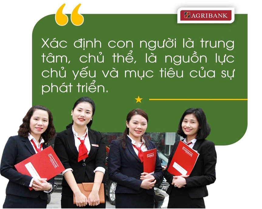 Xác định con người là trung tâm, là chủ thể, là nguồn lực quan trọng nhất và cũng là mục tiêu của phát triển, Agribank đặc biệt chú trọng xây dựng đội ngũ cán bộ phát triển toàn diện. Trọng tâm là đổi mới công tác giáo dục, đào tạo; nâng cao chất lượng nguồn nhân lực; sắp xếp, sử dụng hiệu quả lao động; hoàn thiện cơ chế tiền lương, thi đua, khen thưởng theo hướng công khai, minh bạch, gắn với hiệu quả công việc, các phong trào thi đua, lao động; có chính sách khuyến khích phù hợp đối với nhân lực chất lượng cao, đặc biệt lĩnh vực công nghệ thông tin, từ đó tạo động lực để người lao động yên tâm cống hiến, nâng cao năng suất lao động, cải thiện thu nhập, ổn định tư tưởng và củng cố niềm tin vào sự nghiệp đổi mới của Đảng và Agribank.
