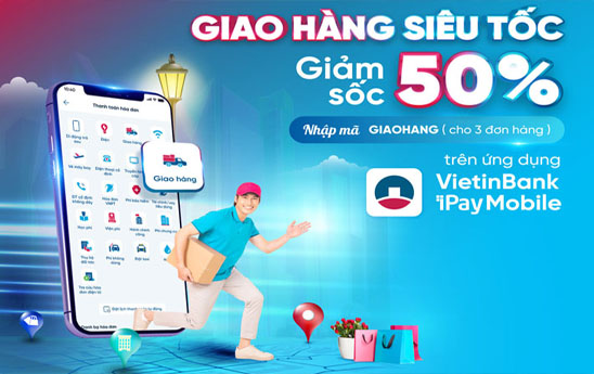 Từ ngày 09/5 - 17/6/2022, khi đặt giao hàng trên VietinBank iPay Mobile và nhập mã GIAOHANG, khách hàng sẽ nhận được ưu đãi 50% tối đa 25.000 đồng áp dụng cho 3 đơn hàng.