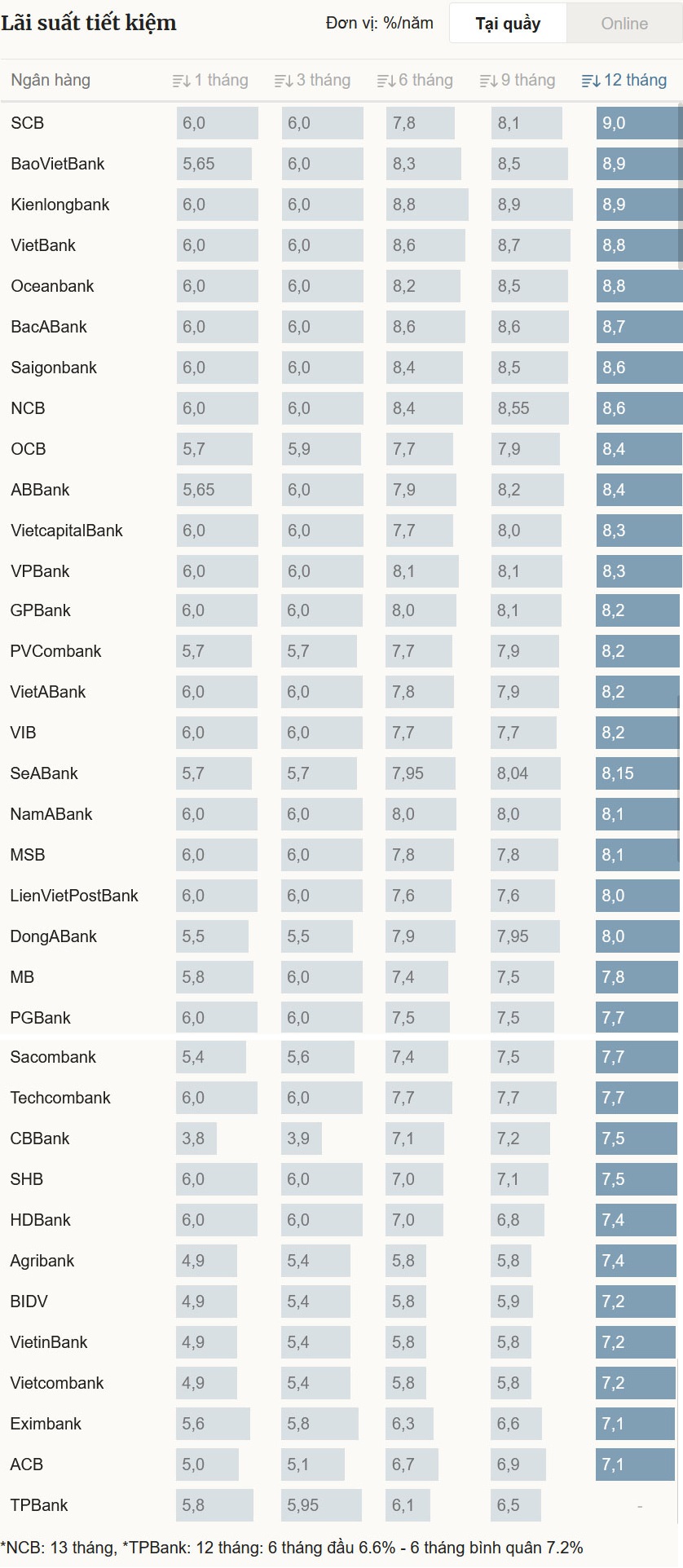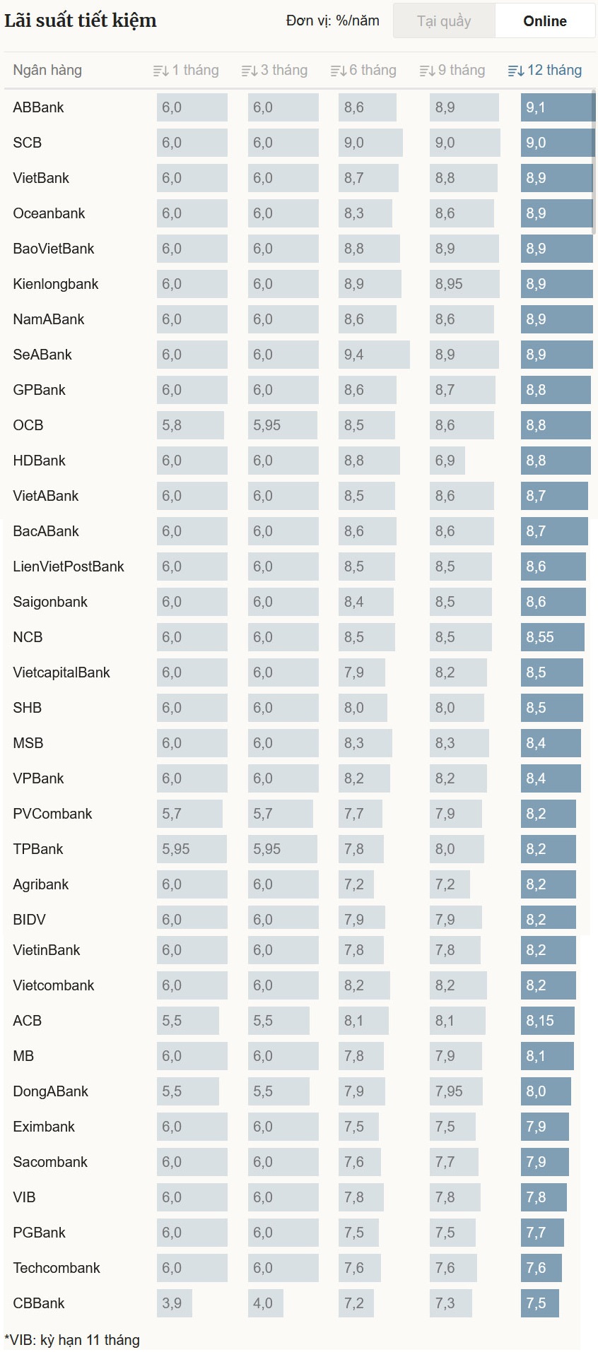 Hiện tại, chỉ còn 2 ngân hàng niêm yết lãi suất trên 9% một năm gồm ABBank (9,1%) và SCB (9%) một năm. Phần lớn nhà băng tư nhân còn lại niêm yết lãi suất cao nhất 8-9% một năm. Một số đơn vị niêm yết lãi suất dưới 8% gồm Sacombank, VIB, Techcombank, CBBank và PGBank.
