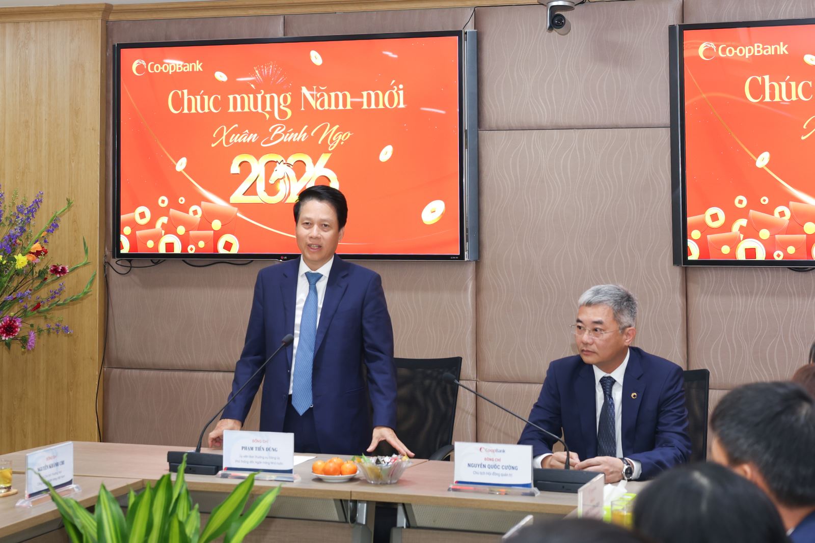 Tại Co-opBank, thay mặt Ban Thường vụ Đảng ủy, Ban Lãnh đạo NHNN, Phó Thống đốc Phạm Tiến Dũng đã gửi những lời chúc mừng tốt đẹp nhất tới toàn thể lãnh đạo, cán bộ và người lao động nhân dịp Xuân mới Bính Ngọ 2026. Phó Thống đốc Phạm Tiến Dũng đã đề nghị Hội đồng Quản trị, Ban điều hành và toàn thể cán bộ, nhân viên Co-opBank tiếp tục phát huy những thành quả đã đạt được trong thời gian qua và nỗ lực thực hiện tốt các nhiệm vụ đã nêu tại Chỉ thị 01, Chỉ thị 02 được NHNN ban hành sau khi Chính phủ ban hành Nghị quyết 01.