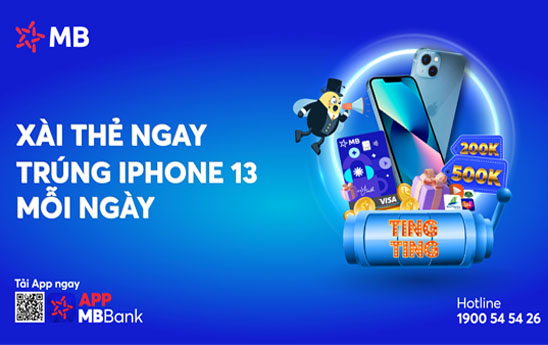 Từ ngày 12/11/2021 đến - 09/02/2022, Ngân hàng Quân đội (MB) triển khai chương trình quay thưởng may mắn "Xài thẻ ngay - Trúng iPhone 13 mỗi ngày" cho chủ thẻ tín dụng MB.