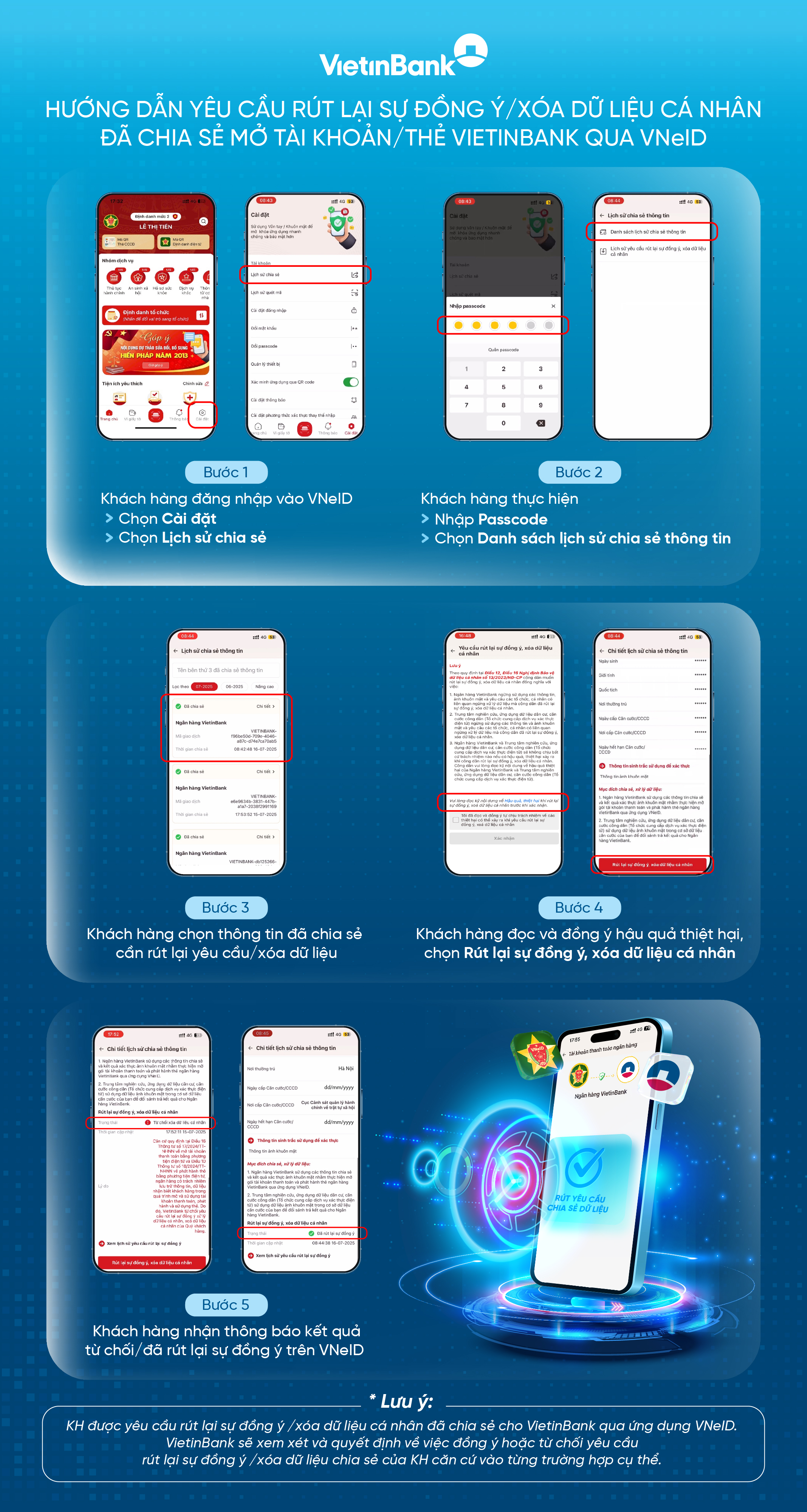 Ngoài ra, Khách hàng có thể chủ động rút lại yêu cầu chia sẻ dữ liệu cá nhân với VietinBank khi thực hiện đăng ký mở TKTT ngay trên VNeID, xem chi tiết tại đây.