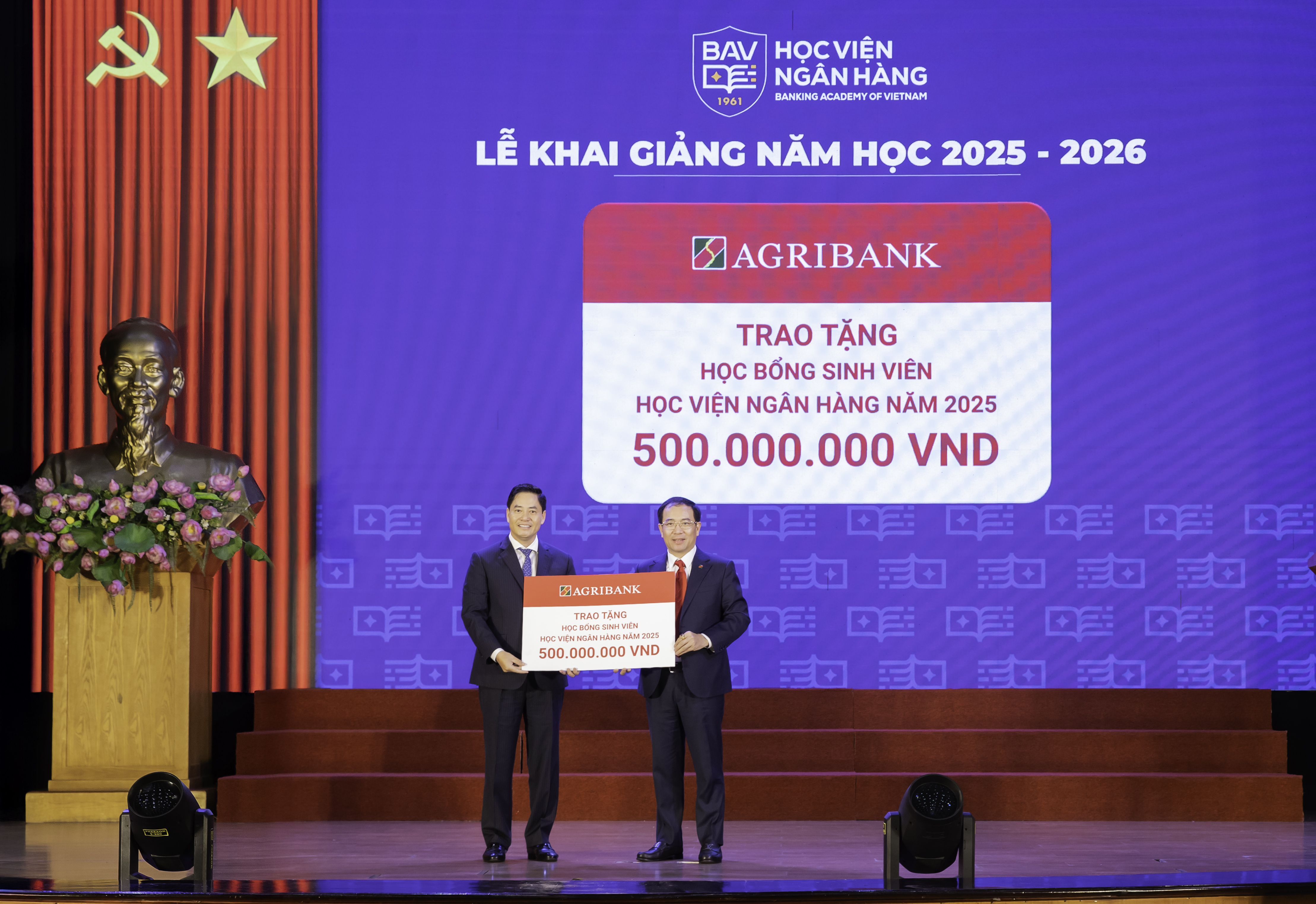 Agribank với vai trò Nhà tài trợ Kim cương, đã trao 500 triệu đồng học bổng cho các sinh viên xuất sắc. Đại diện Agribank, ông Đoàn Ngọc Lưu - Phó Tổng Giám đốc, nhấn mạnh: “Agribank luôn coi đầu tư cho giáo dục là đầu tư cho tương lai. Học bổng không chỉ là phần thưởng mà còn là cam kết đồng hành cùng thế hệ tri thức trẻ - nguồn nhân lực tương lai của ngành ngân hàng và đất nước”.