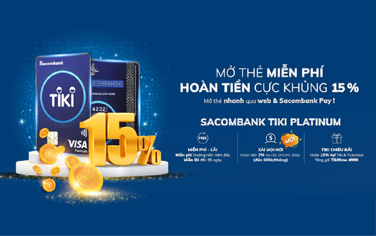 Thẻ tín dụng Sacombank Tiki Platinum được chính thức ra mắt từ tháng 5/2020 với các tính năng nổi bật như: tỷ lệ hoàn tiền cao nhất ngành thương mại điện tử Việt Nam hiện nay với mức hoàn lên đến 15% khi mua sắm trên Tiki; hoàn 100% phí thường niên năm đầu và tặng gói TikiNOW 499.000 đồng/năm khi kích hoạt thẻ và chi tiêu từ 2 triệu đồng tại Tiki.