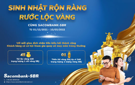 Từ ngày 01/12/2021 - 10/3/2022, trong dịp kỷ niệm 30 năm thành lập Ngân hàng Sài Gòn Thương tín (Sacombank) triển khai chương trình “Sinh nhật rộn ràng - Rước lộc vàng cùng Sacombank-SBR” dành cho khách hàng sử dụng dịch vụ nhận tiền kiều hối của Công ty TNHH MTV Kiều hối Sacombank (SBR) với có cơ hội tham gia quay số trúng thưởng may mắn với tổng giá trị giải thưởng lên đến 300.000.000 đồng.