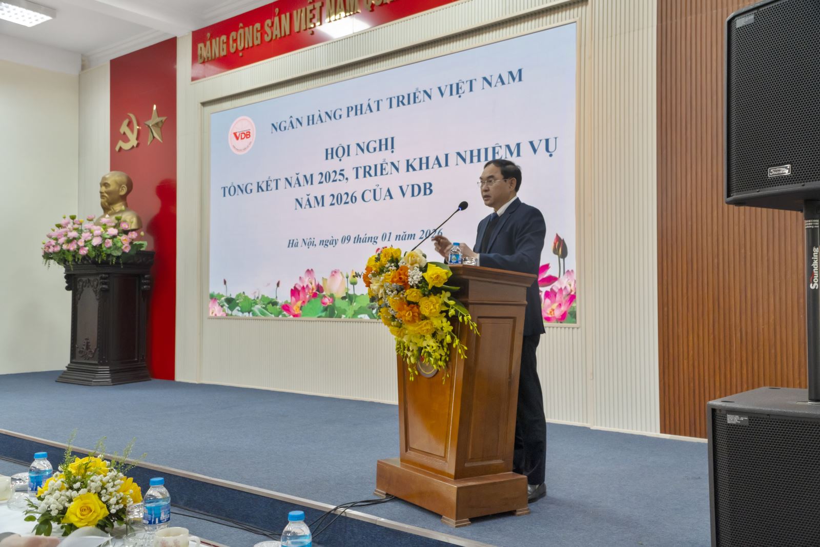 Phát biểu tại Hội nghị, Tổng Giám đốc VDB nhấn mạnh: năm 2025 là năm bản lề trong triển khai Phương án cơ cấu lại VDB giai đoạn 2023 - 2027. Trong bối cảnh nhiều khó khăn, toàn hệ thống đã nỗ lực triển khai đồng bộ các giải pháp và cơ bản hoàn thành, nhiều chỉ tiêu vượt kế hoạch, đặc biệt là tăng trưởng tín dụng, xử lý nợ xấu, thu hồi nợ và kết quả tài chính, qua đó tiếp tục khẳng định vai trò là công cụ tài chính của Chính phủ. Tổng Giám đốc khẳng định những kết quả đạt được là nền tảng quan trọng để VDB bước vào năm 2026 - năm có ý nghĩa quyết định đối với thành công của tiến trình cơ cấu lại, với yêu cầu tiếp tục đổi mới quản trị, đẩy mạnh hiện đại hóa Công nghệ thông tin, nâng cao hiệu quả hoạt động và phục vụ tốt hơn các mục tiêu phát triển kinh tế - xã hội.