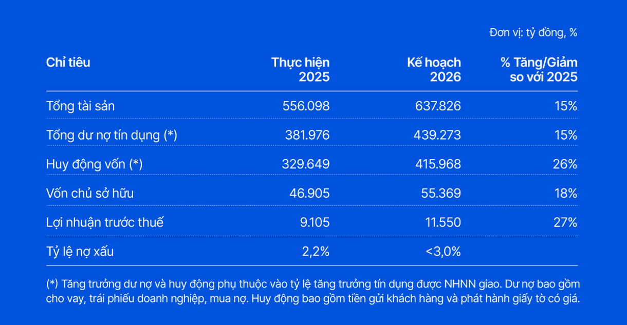 Trên nền tảng đó, Ngân hàng kỳ vọng đạt lợi nhuận trước thuế 11.550 tỷ đồng, tăng 27% so với năm 2025, tiếp tục duy trì hiệu quả hoạt động nhờ tối ưu danh mục tài sản, cải thiện biên lợi nhuận và kiểm soát chi phí.