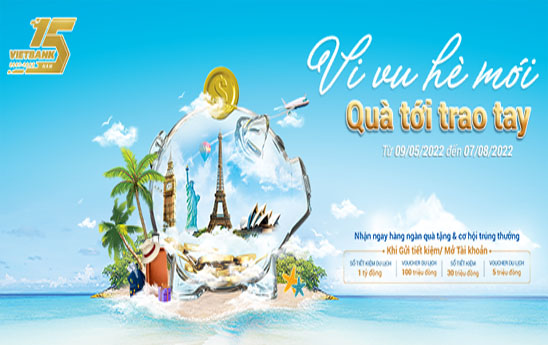 Từ ngày 09/5 - 07/8/2022, Ngân hàng Việt Nam Thương tín (Vietbank) triển khai chương trình khuyến mãi "Vi vu hè mới - Quà tới trao tay" với tổng giải thưởng, quà tặng dành cho khách hàng gửi tiết kiệm và tài khoản tại ngân hàng lên đến hơn 6 tỷ đồng.