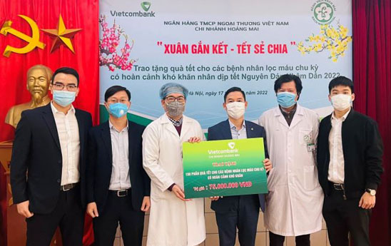 Vừa qua, Công đoàn & Đoàn thanh niên Ngân hàng Ngoại thương Việt Nam (Vietcombank) Chi nhánh Hoàng Mai đã phối hợp với Trung tâm Thận tiết niệu & lọc máu (Bệnh viện Bạch Mai) tổ chức chương trình “Xuân gắn kết - Tết sẻ chia” năm 2022 với mong muốn các bệnh nhân khó khăn tại đây thêm niềm vui và sự ấm áp khi Tết đến.