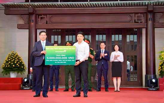 Nhân dịp này, Chủ tịch nước kêu gọi các doanh nghiệp, các nhà hảo tâm tiếp tục ủng hộ Chương trình “Mái ấm nghĩa tình, an sinh xã hội”, góp phần xóa bỏ những căn nhà dột nát trên địa bàn tỉnh Điện Biên và hoàn thành nhiều công trình phúc lợi xã hội vào dịp kỷ niệm 70 năm Chiến thắng Điện Biên Phủ sắp tới. Dưới sự chứng kiến của Chủ tịch nước và các đại biểu, các địa phương, doanh nghiệp và các nhà hảo tâm đã ủng hộ, tài trợ số tiền trên 150 tỷ đồng, trong đó Vietcombank trao tặng số tiền 5 tỷ đồng.