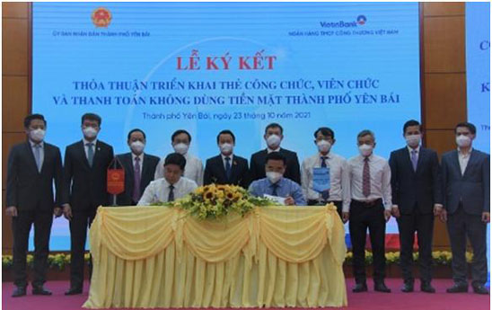 Theo đó, VietinBank và UBND TP. Yên Bái phối hợp triển khai Đề án Thẻ điện tử công chức, viên chức thành phố và phát triển thanh toán không dùng tiền mặt trên địa bàn TP. Yên Bái giai đoạn 2020 - 2025, định hướng đến 2030 theo Quyết định số 3957 ngày 9/11/2020 của UBND TP. Yên Bái.