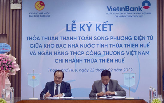 Ngày 22/02/2022, Ngân hàng Công thương Việt Nam (VietinBank) Chi nhánh Thừa Thiên Huế và Kho bạc Nhà nước tỉnh Thừa Thiên Huế đã tổ chức Lễ ký kết Thỏa thuận hợp tác triển khai Dịch vụ thu chi ngân sách điện tử cho các đối tượng nộp/hưởng ngân hàng nhà nước.