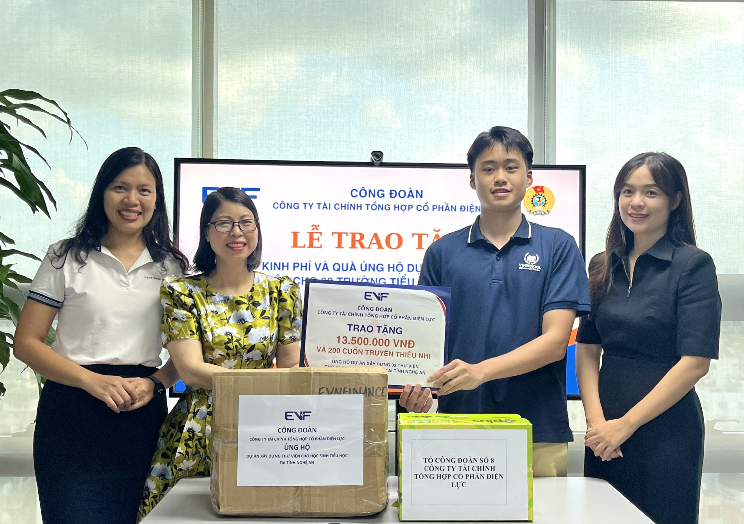 Ngày 12/9, Ban Chấp hành Công đoàn Công ty Tài chính Tổng hợp Cổ phần Điện lực (EVF) đã trao tặng 13,5 triệu đồng và 200 cuốn truyện thiếu nhi cho nhóm dự án “TRONG.project”, nhằm xây dựng thư viện tại điểm trường Tiểu học Làng Yên và Tiểu học Thái Hòa (xã Môn Sơn, tỉnh Nghệ An).
