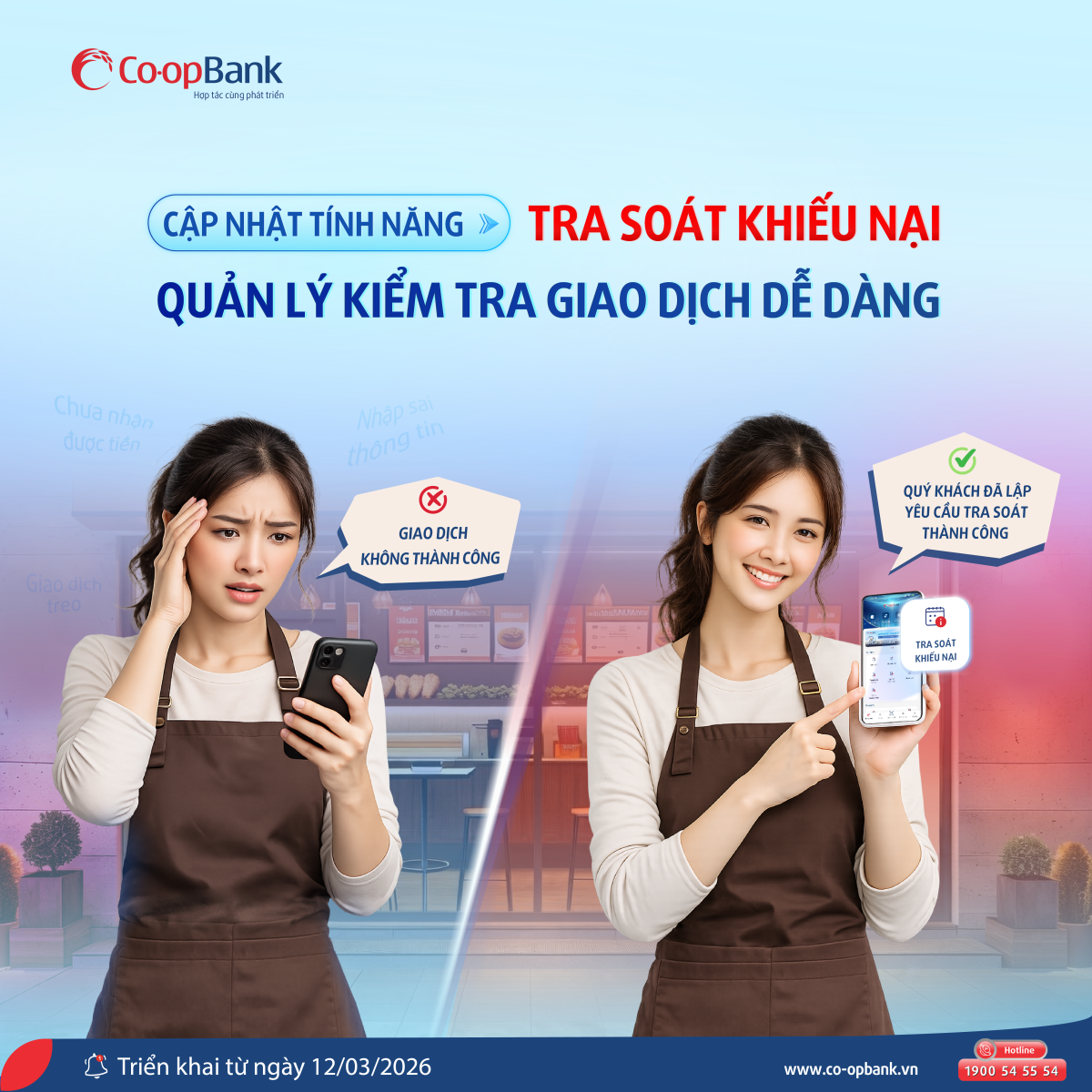 Từ ngày 12/3/2026, Ngân hàng Hợp tác xã Việt Nam (Co-opBank) chính thức cập nhật phiên bản mới của ứng dụng Co-opBank Mobile Banking, bổ sung tính năng tra soát khiếu nại trực tuyến, mở rộng tiện ích QR tại màn hình đăng nhập và tăng cường các giải pháp bảo mật giao dịch.