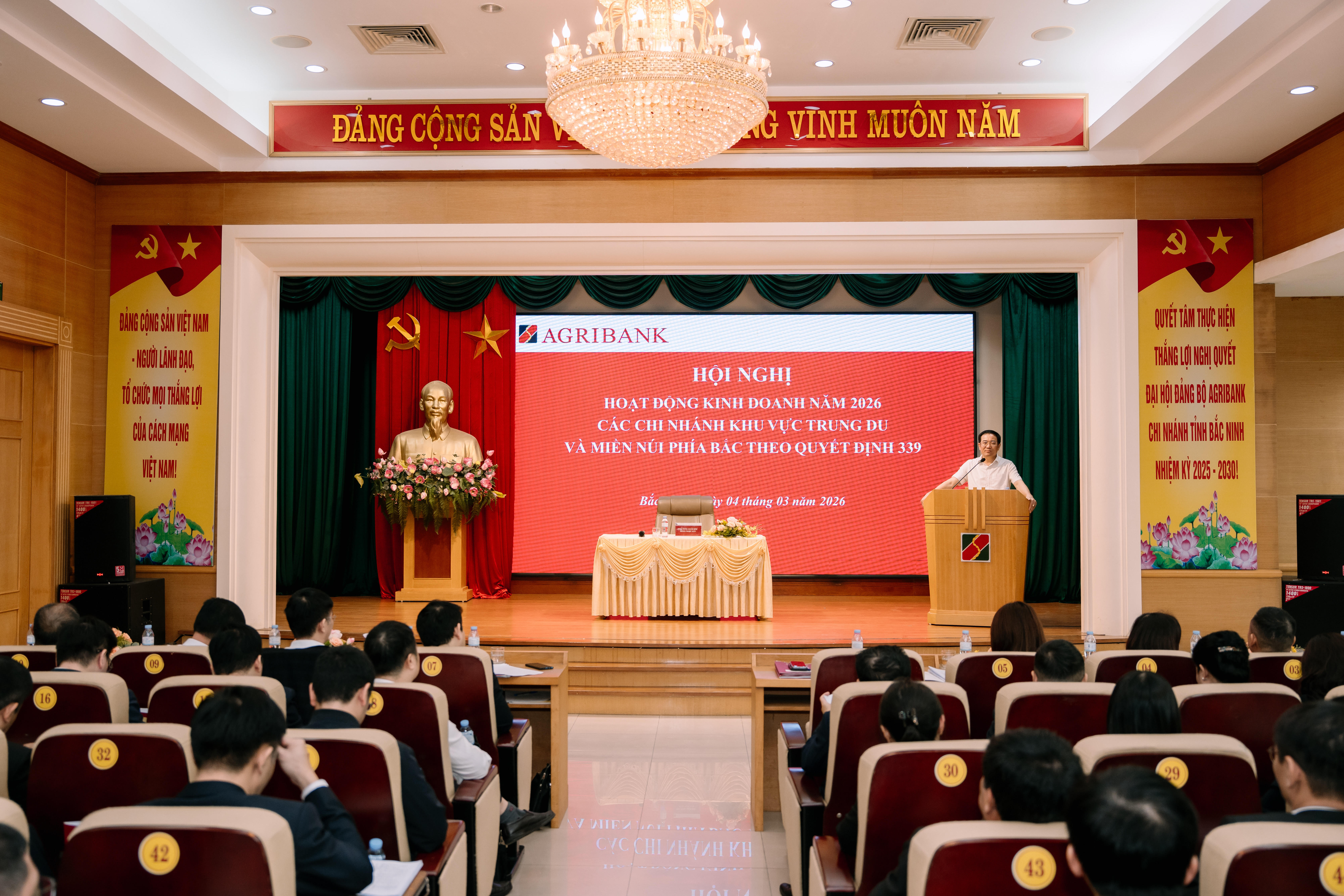 Ngày 4/3/2026, Ngân hàng Nông nghiệp và Phát triển Nông thôn Việt Nam (Agribank) tổ chức Hội nghị đánh giá kết quả hoạt động kinh doanh cùng tiến độ thực hiện kế hoạch năm 2026 của các chi nhánh khu vực Trung du và miền núi phía Bắc tại tỉnh Bắc Ninh.