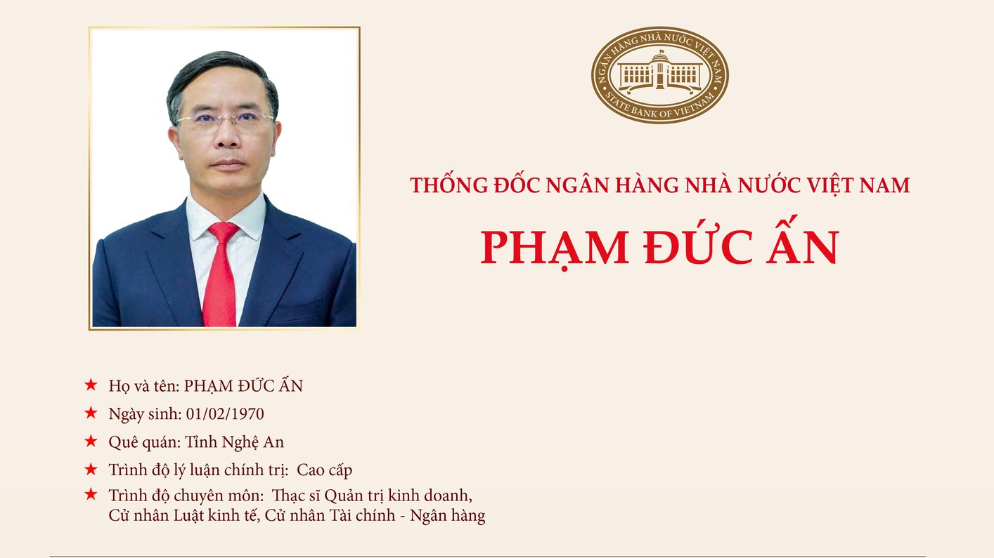 Sáng 8/4/2026, tại Kỳ họp thứ Nhất, Quốc hội khóa XVI, Quốc hội đã biểu quyết thông qua Nghị quyết phê chuẩn đề nghị của Thủ tướng Chính phủ về việc bổ nhiệm các thành viên của Chính phủ nhiệm kỳ 2026–2031, trong đó ông Phạm Đức Ấn được phê chuẩn giữ chức Thống đốc Ngân hàng Nhà nước Việt Nam.