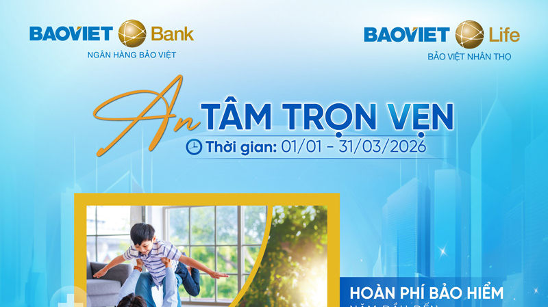 Từ ngày 01/01 đến 31/03/2026, Ngân hàng TMCP Bảo Việt (BAOVIET Bank) phối hợp cùng Tổng Công ty Bảo Việt Nhân thọ triển khai chương trình ưu đãi “An tâm trọn vẹn”, dành cho khách hàng có tiền gửi tại ngân hàng khi tham gia bảo hiểm nhân thọ qua kênh Bancassurance.