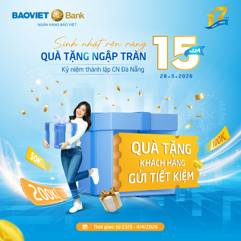 Từ ngày 23/3 đến hết ngày 4/4/2026, Ngân hàng TMCP Bảo Việt (BAOVIET Bank) triển khai chương trình khuyến mại “Sinh nhật rộn ràng - Quà tặng ngập tràn”, nhằm tri ân khách hàng giao dịch nhân dịp kỷ niệm 15 năm thành lập chi nhánh Đà Nẵng (28/3/2011 - 28/3/2026).