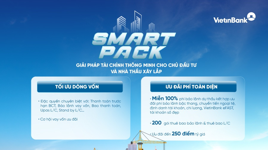 Đáp ứng nhu cầu ngày càng lớn của ngành xây dựng, VietinBank ra mắt SMART PACK – gói giải pháp tài chính thiết kế riêng cho chủ đầu tư và nhà thầu xây lắp. Chương trình giúp doanh nghiệp tối ưu dòng tiền, tiết giảm chi phí và nâng cao hiệu quả tài chính.