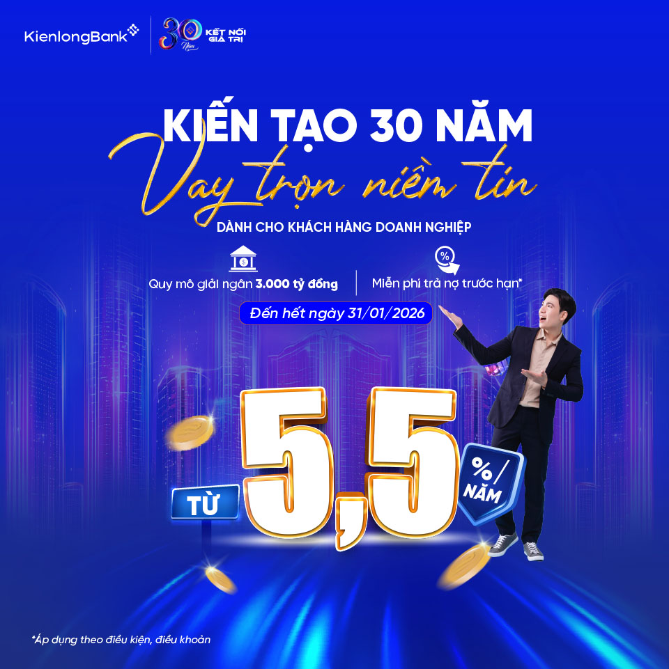 Hướng tới kỷ niệm 30 năm thành lập, Ngân hàng TMCP Kiên Long (KienlongBank) triển khai chương trình tín dụng “Kiến tạo 30 năm - Vay trọn niềm tin” với quy mô 3.000 tỷ đồng, mang đến cơ hội tiếp cận vốn ưu đãi cho khách hàng doanh nghiệp.
