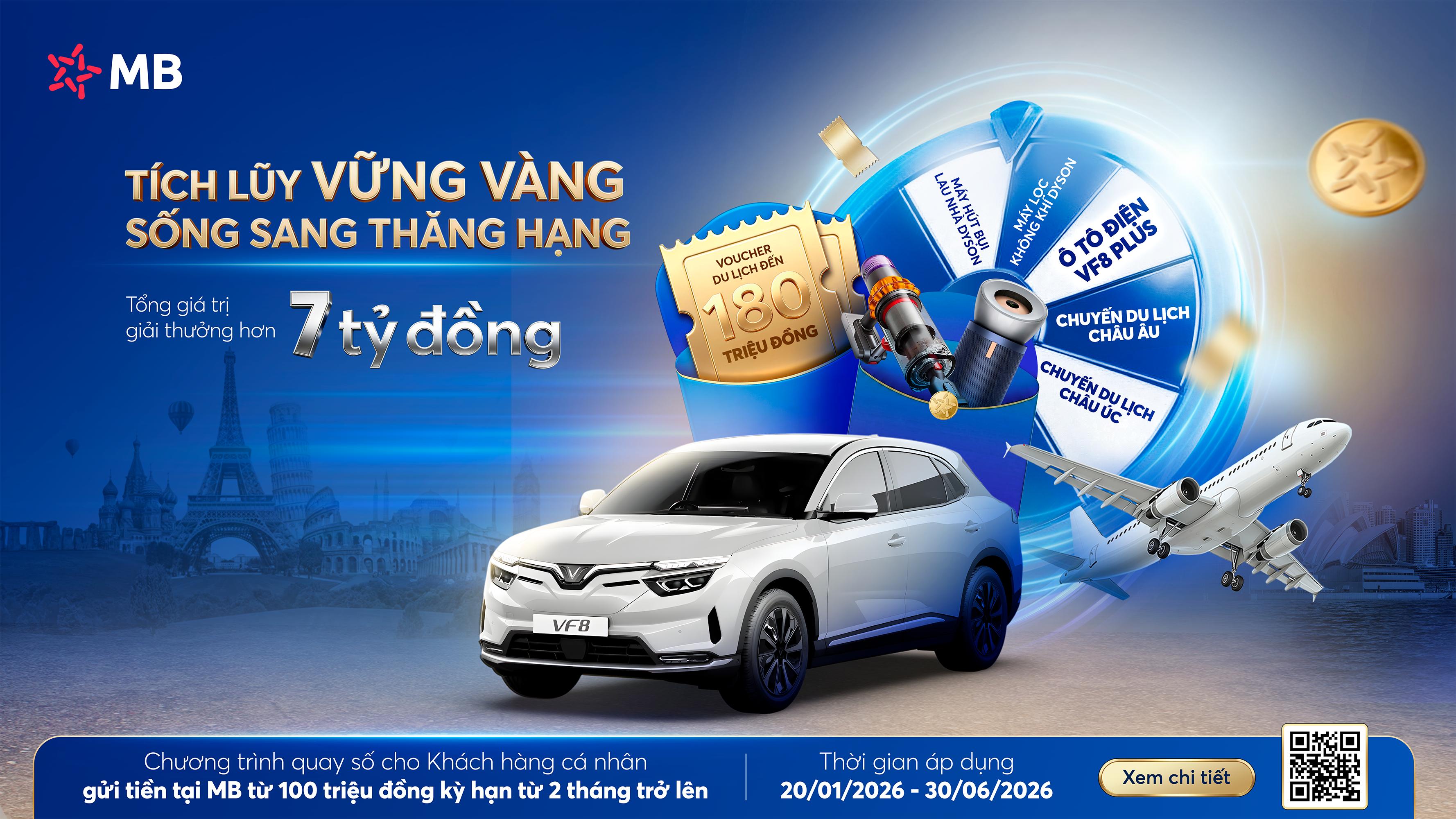 Nhằm gia tăng quyền lợi cho khách hàng cá nhân gửi tiền, Ngân hàng TMCP Quân đội (MB) vừa triển khai chương trình huy động vốn với chủ đề “Tích lũy vững vàng - Sống sang thăng hạng”, mang đến cơ hội nhận nhiều phần quà giá trị với tổng giá trị giải thưởng lên tới hơn 7 tỷ đồng.